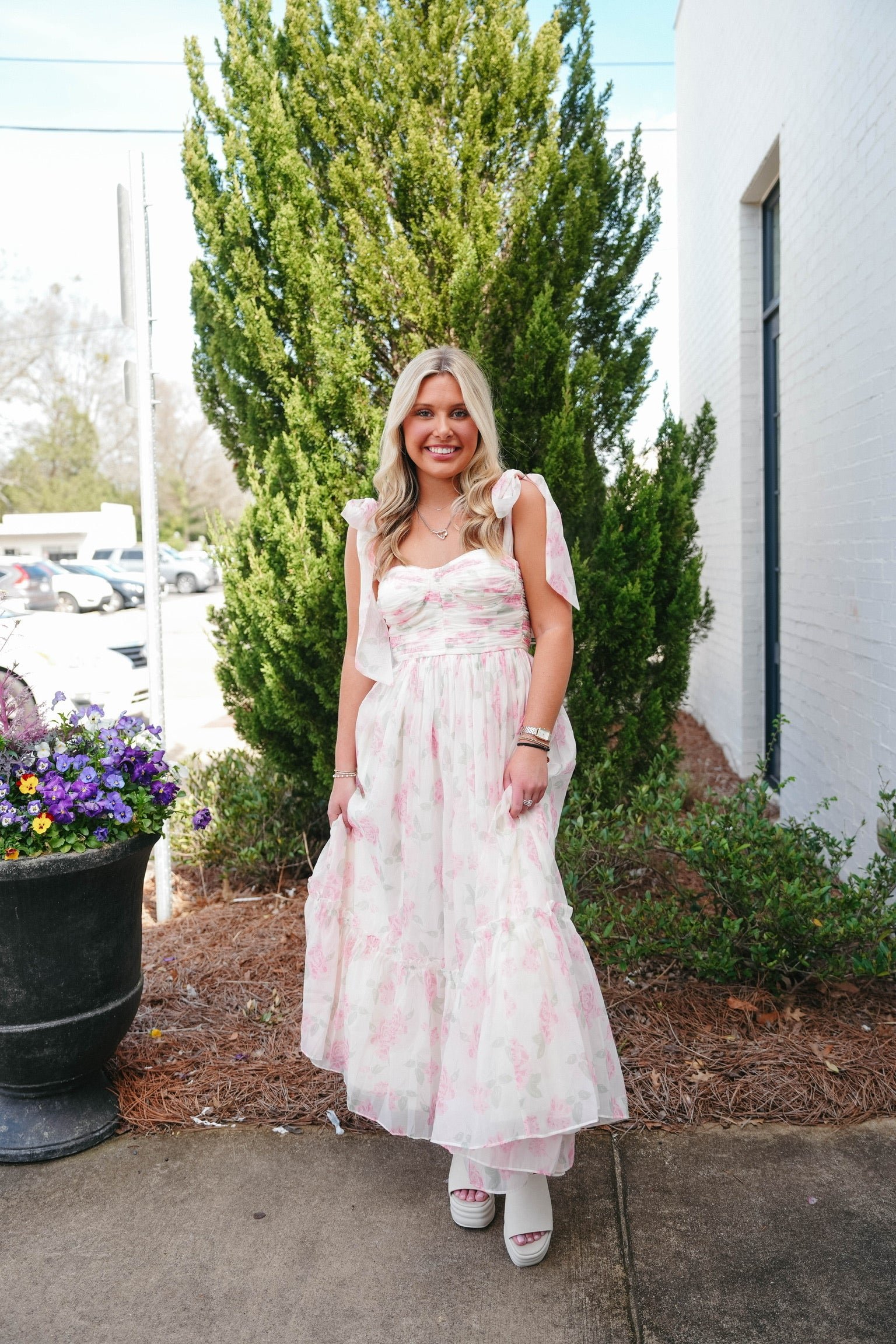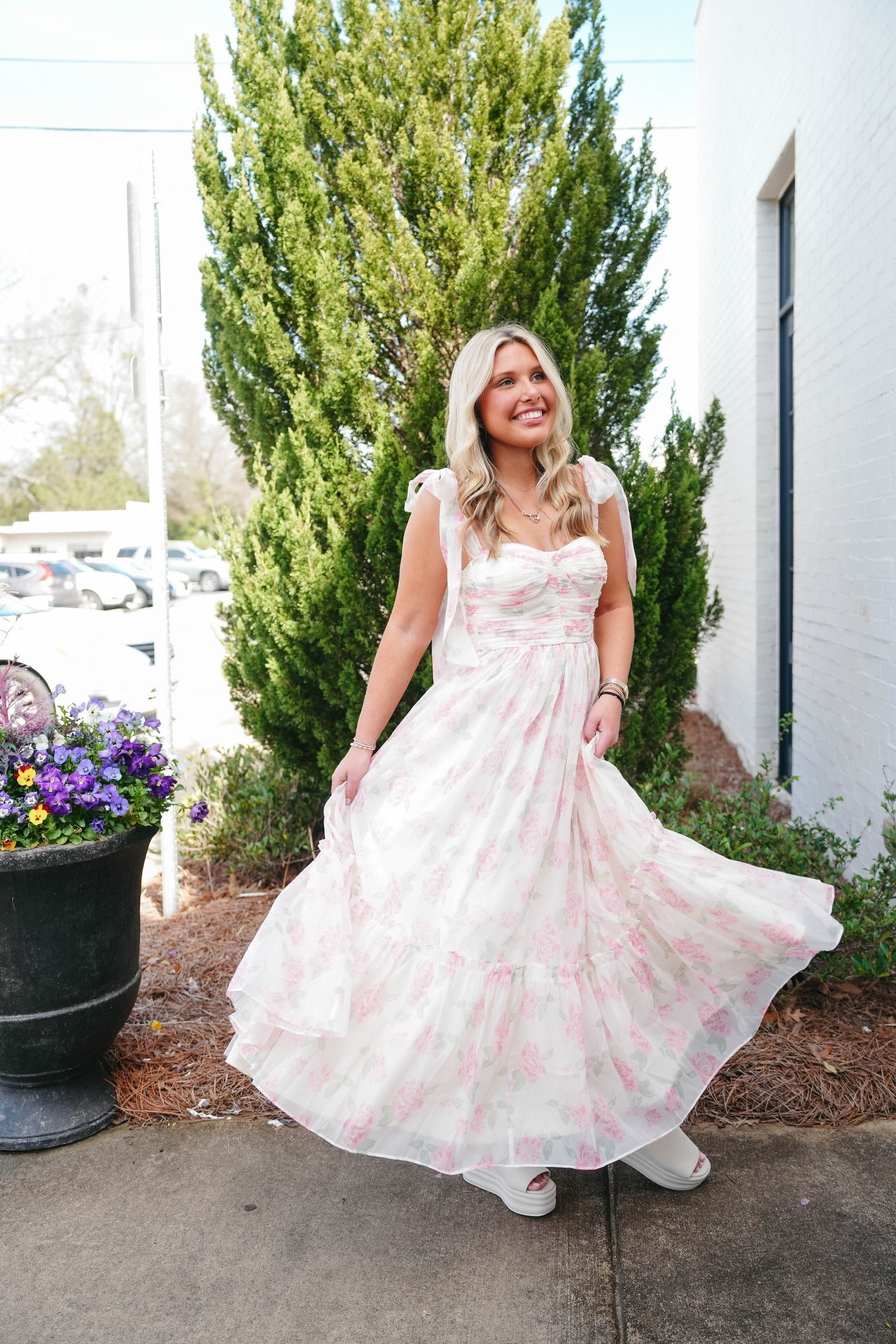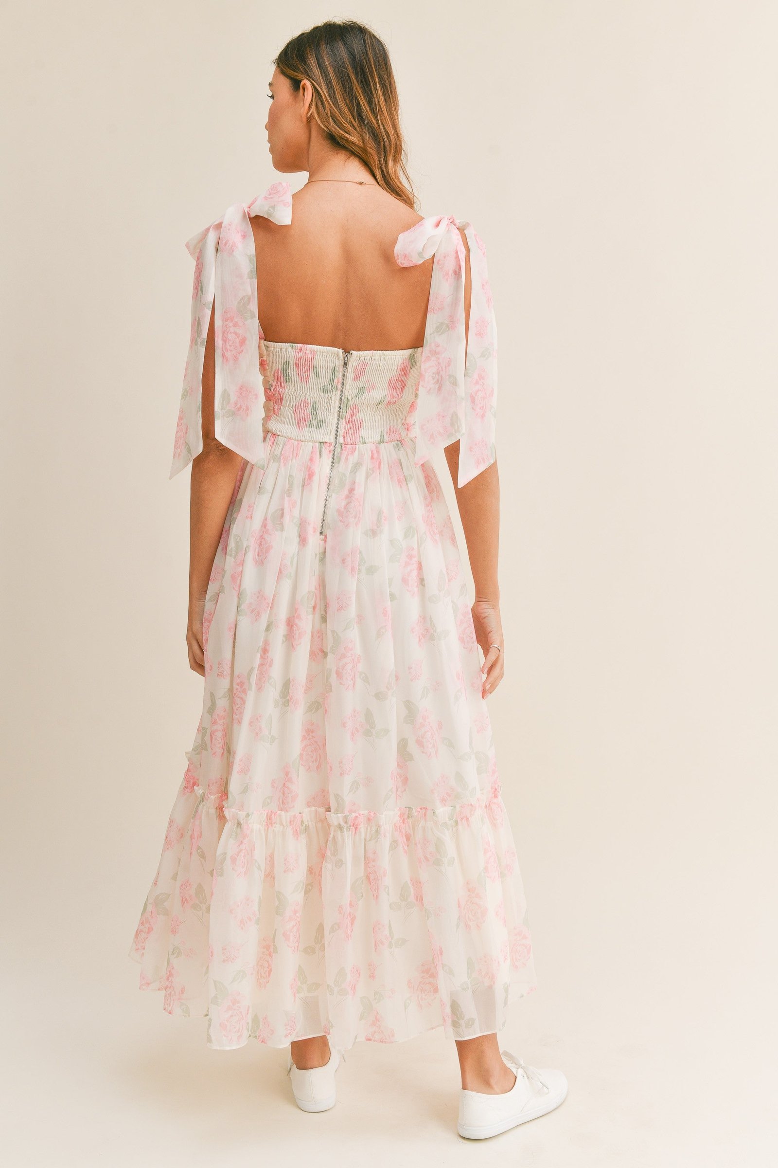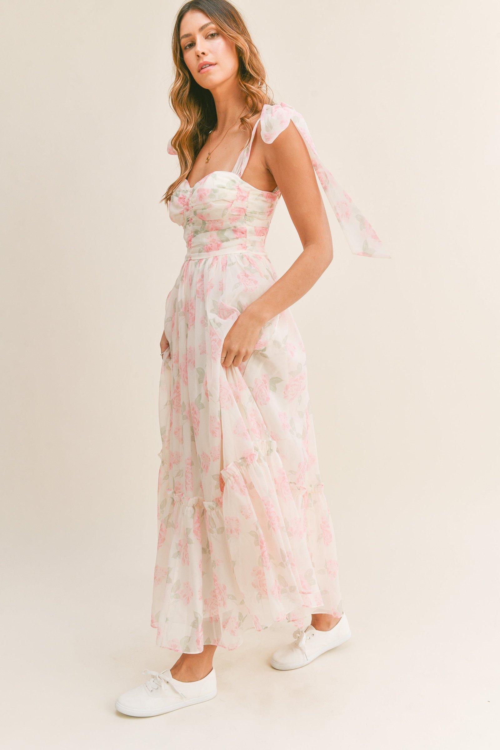 • Chiffon floral print ruched bust with light bracup tiered midi dress with self tie shoulder straps.