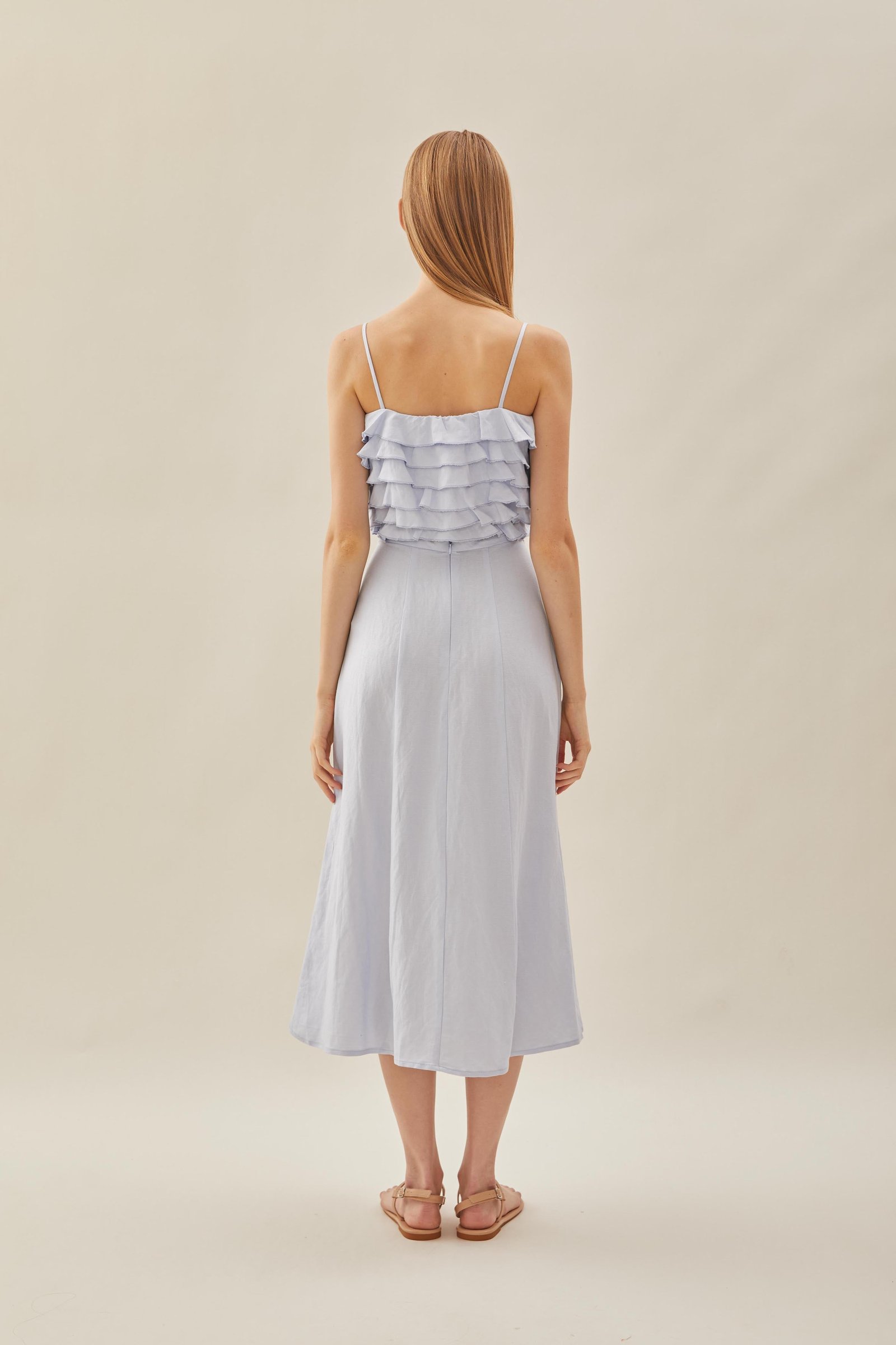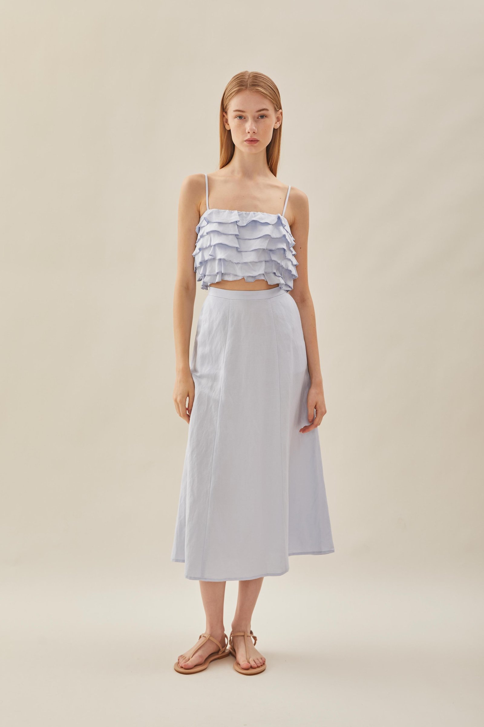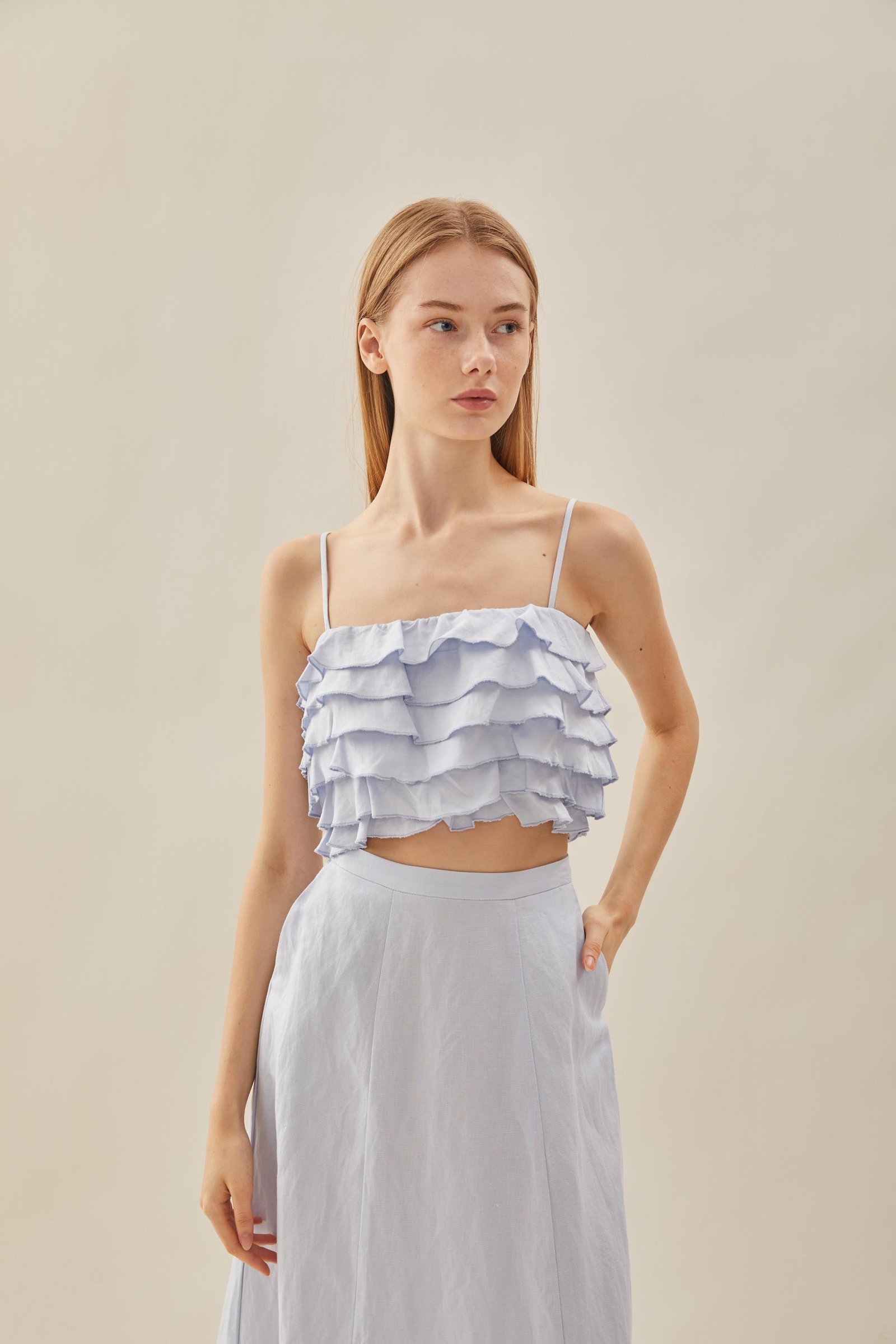 Designed for the balmy weather. featuring a cropped bodice with tiered ruffle details. Soft and lightweight with slight stretch. made from 100% linen to tide you through summer and beyond.