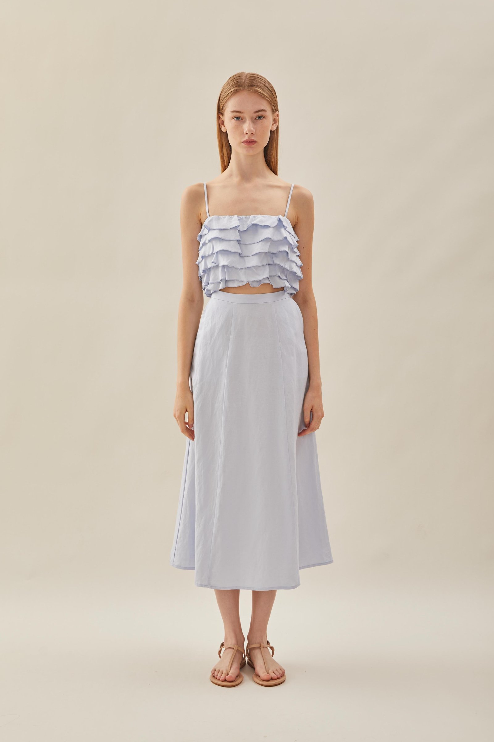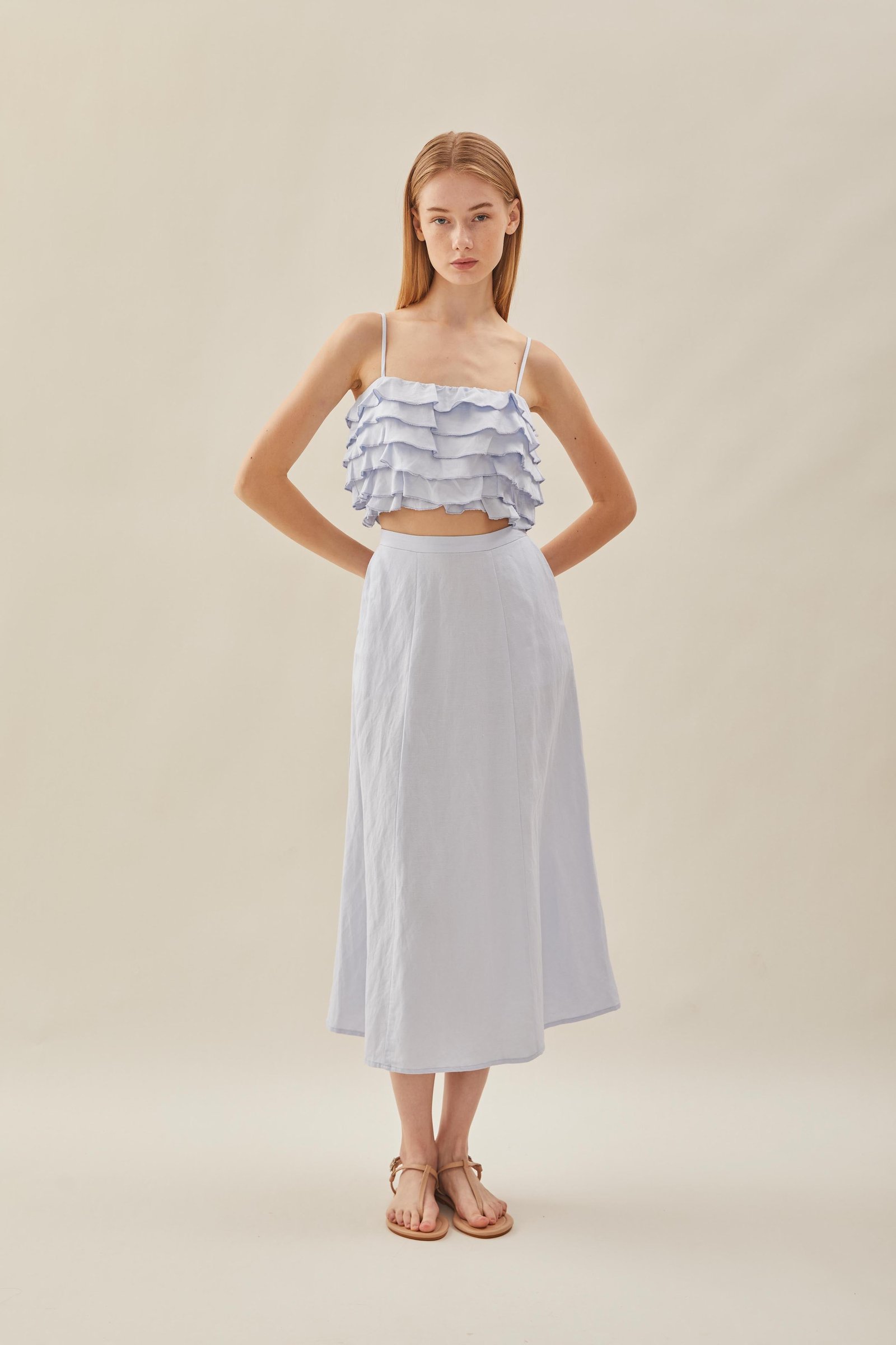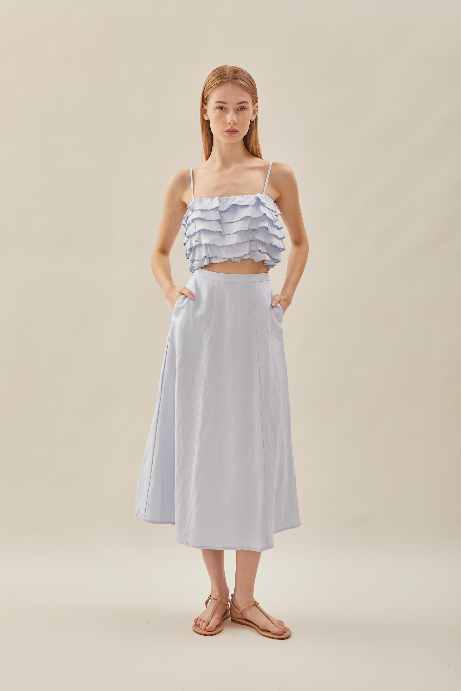 Designed for the balmy weather. featuring a cropped bodice with tiered ruffle details. Soft and lightweight with slight stretch. made from 100% linen to tide you through summer and beyond.